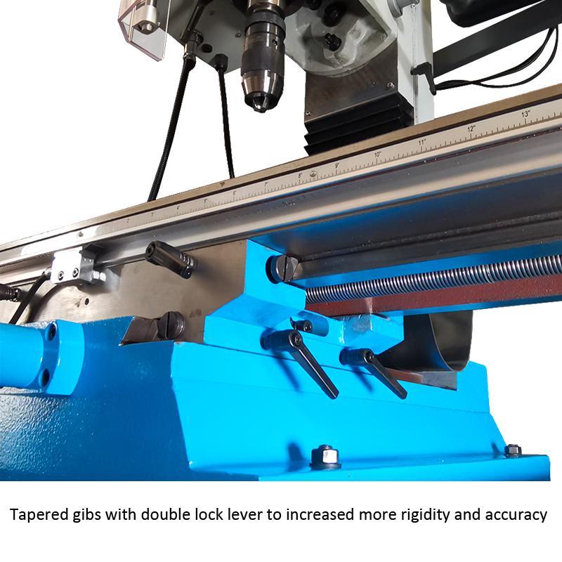 Máy được trang bị cơ chế xuống dao tinh (fine feed), giúp kiểm soát chính xác khi gia công. Ngoài ra còn có hệ thống khóa chắc chắn cho bàn, đầu và trục chính, đảm bảo độ ổn định khi làm việc.