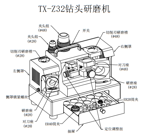 Nó có thể làm sắc nét góc đầu (góc đỉnh), lưỡi cắt phía trước (góc nghiêng dương), rãnh phoi (góc sau) và kích thước của lưỡi cắt ngang trung tâm có thể được điều chỉnh theo ý muốn.